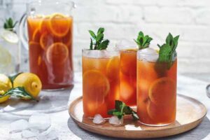 طرز تهیه: چای سرد را با آبمیوه مخلوط کنید، یخ و برشهای میوه اضافه کرده و سرو کنید.